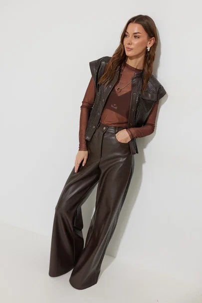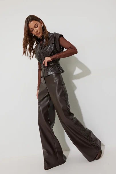 Жилет прямого силуэта из экокожи с перфорацией. Горловина-стойка, по переду застежка на кнопки. Жилет со спущенной линией плеча и отделочными манжетами. По переду кокетка с декоративными клапанами и шлевками для ремня. В комплект входит съемный ремень. Обращаем ваше внимание, что фурнитура может отличаться от фото.