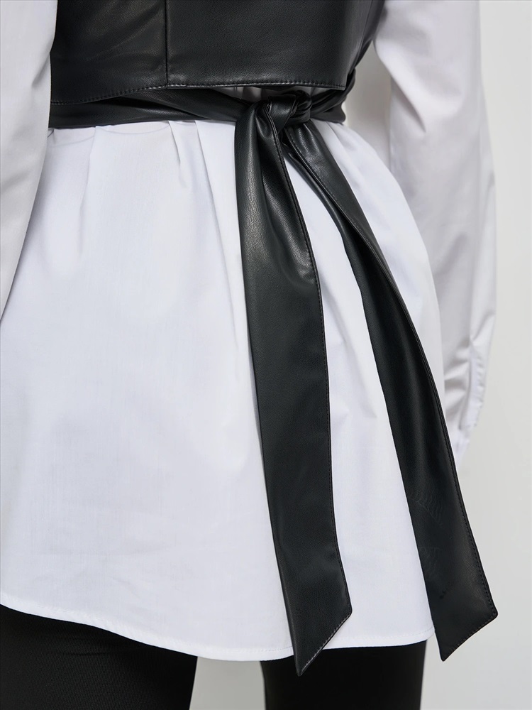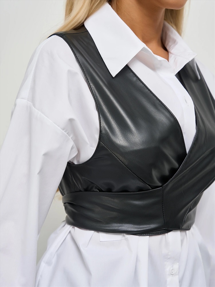 Жилет на запах на завязках из искусственной кожи.