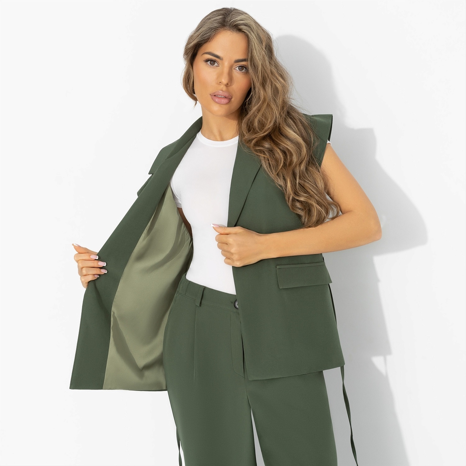 Бывает ли у одежды магия? Отвечаем: «да», и она зелёного цвета. Оттенок жилета чарует, линия плеч собирает восторги, а пояс подчёркивает талию. Надела – и эффект «слишком модно» включился сам. Жилет выполнен из пластичной ткани, красиво держит форму и мягко повторяет движения. Свободный крой балансируется поясом – можно носить приталенно или расслабленно. Идеален в комплекте с брюками, джинсами или поверх платья. Ткань приятна к телу и комфортна в течение дня.