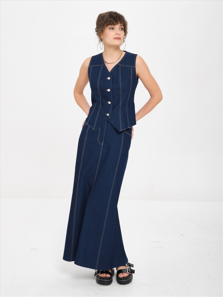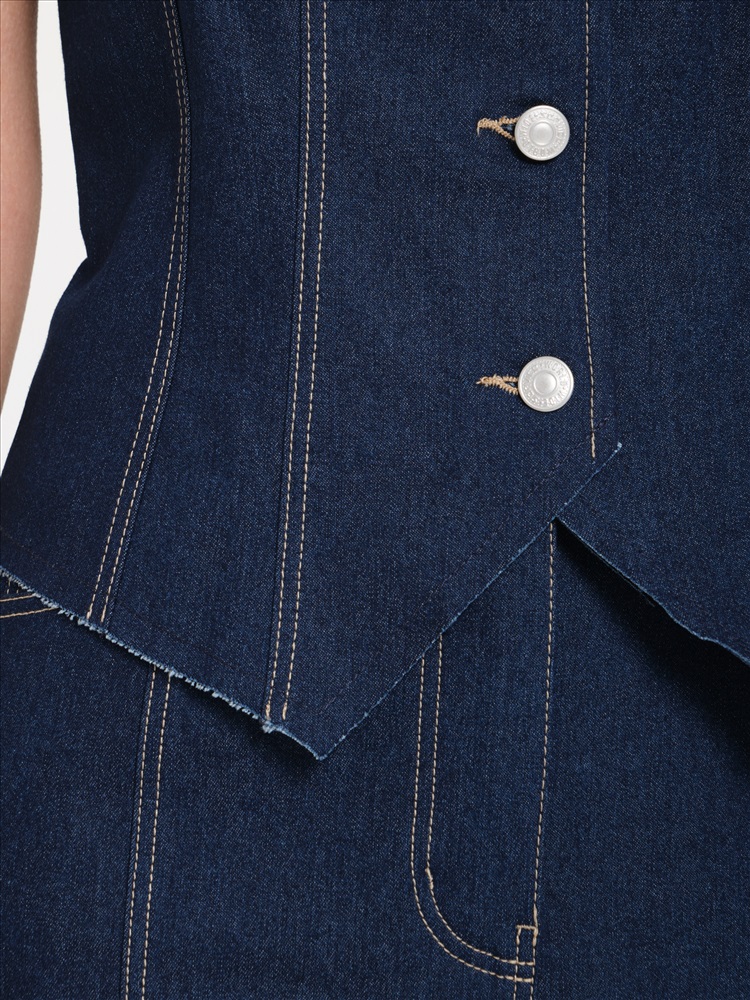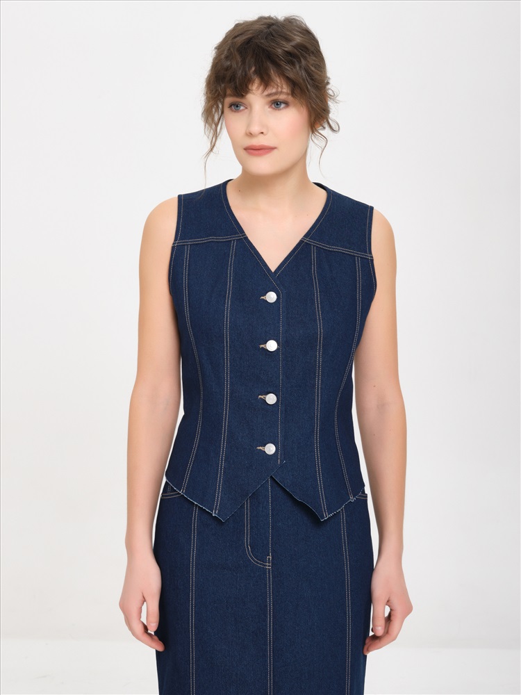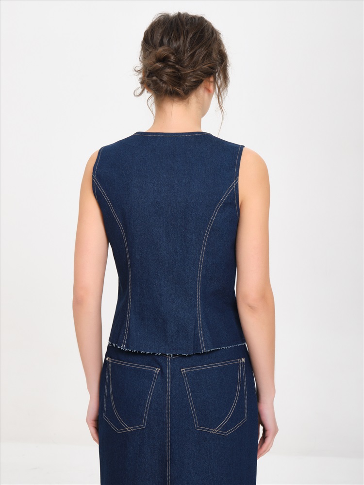 Жилет джинсовый тёмно-синего цвета от фабрики одежды PRIZ., Модель, полуприлегающего силуэта, без подклада. Перед с кокетками, рельефами и центральной застёжкой на петли и пуговицы. Спинка с рельефами. Вырез горловины V-образной формы. Жилет декорирован отделочными строчками. Низ изделия фигурный,с необработанными срезами. Идеальный вариант для стильного образа., Оттенок цвета может незначительно отличаться от фото., Ожидание отправки (рабочих дней): 7, Размер модели: 44., Рост модели: 174 см., Состав:, Хлопок 55%, Полиэстер 41%, Эластан 4%, Тип ткани:, Джинс