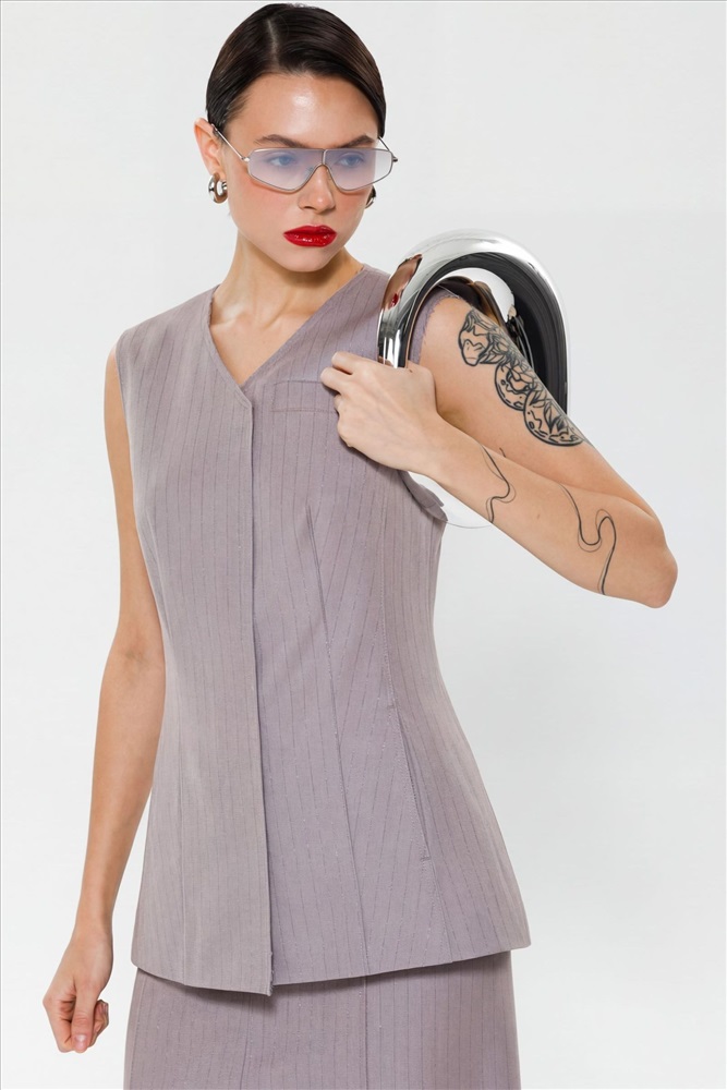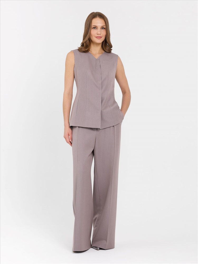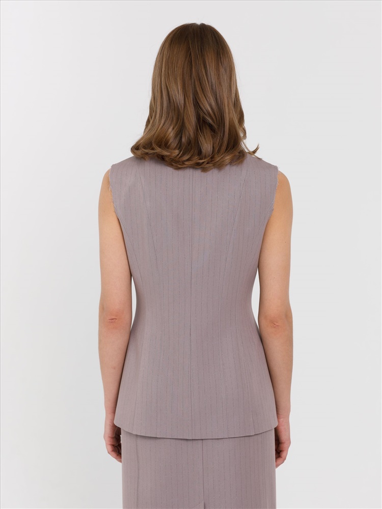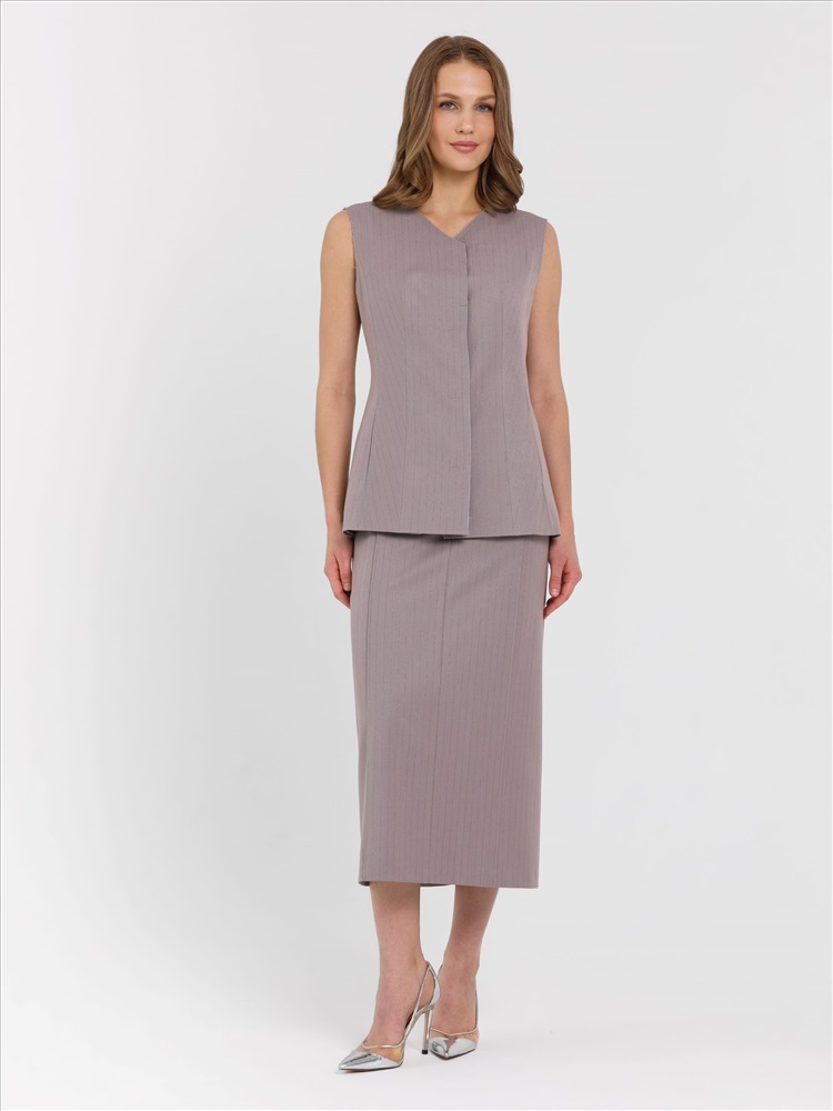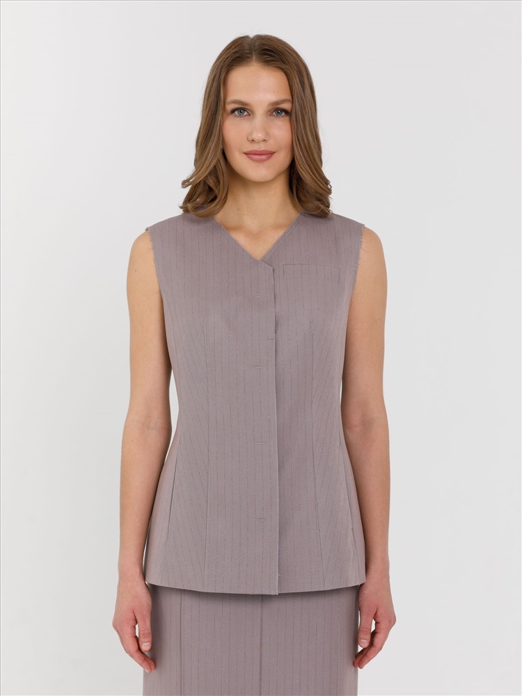 Жилет в полоску с карманами от фабрики одежды PRIZ., Модель, полуприлегающего силуэта, на подкладе. Выполнен из текстильного полотна. Спереди карманы в рельефных швах, а также нагрудный карман с листочкой. Застёжка центральная на потайные магнитные кнопки. Спинка с рельефами и средним швом. Край борта, пройма и вырез горловины обработаны с открытыми срезами. Жилет декорирован отделочными строчками. Идеальный вариант для стильного образа., Оттенок цвета и расположение рисунка могут незначительно отличаться от фото., Ожидание отправки (рабочих дней): 7, Размер модели: 44., Рост модели: 174 см., Состав:, Вискоза 62%, Полиэстер 35%, Эластан 3%, Тип ткани:, Текстиль