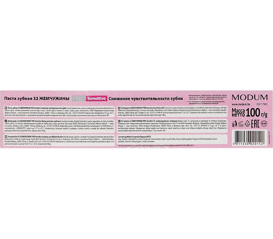 Бренд: MODUM; Изготовитель: CОАО "Парфюмерно-косметическая фабрика "Модум − наша косметика", Республика Беларусь, 220007, г. Минск, ул. Володько, 6/6-5; Серия: 32 Жемчужины; Упаковка: Тюбик; Эффект: Для чувствительных зубов