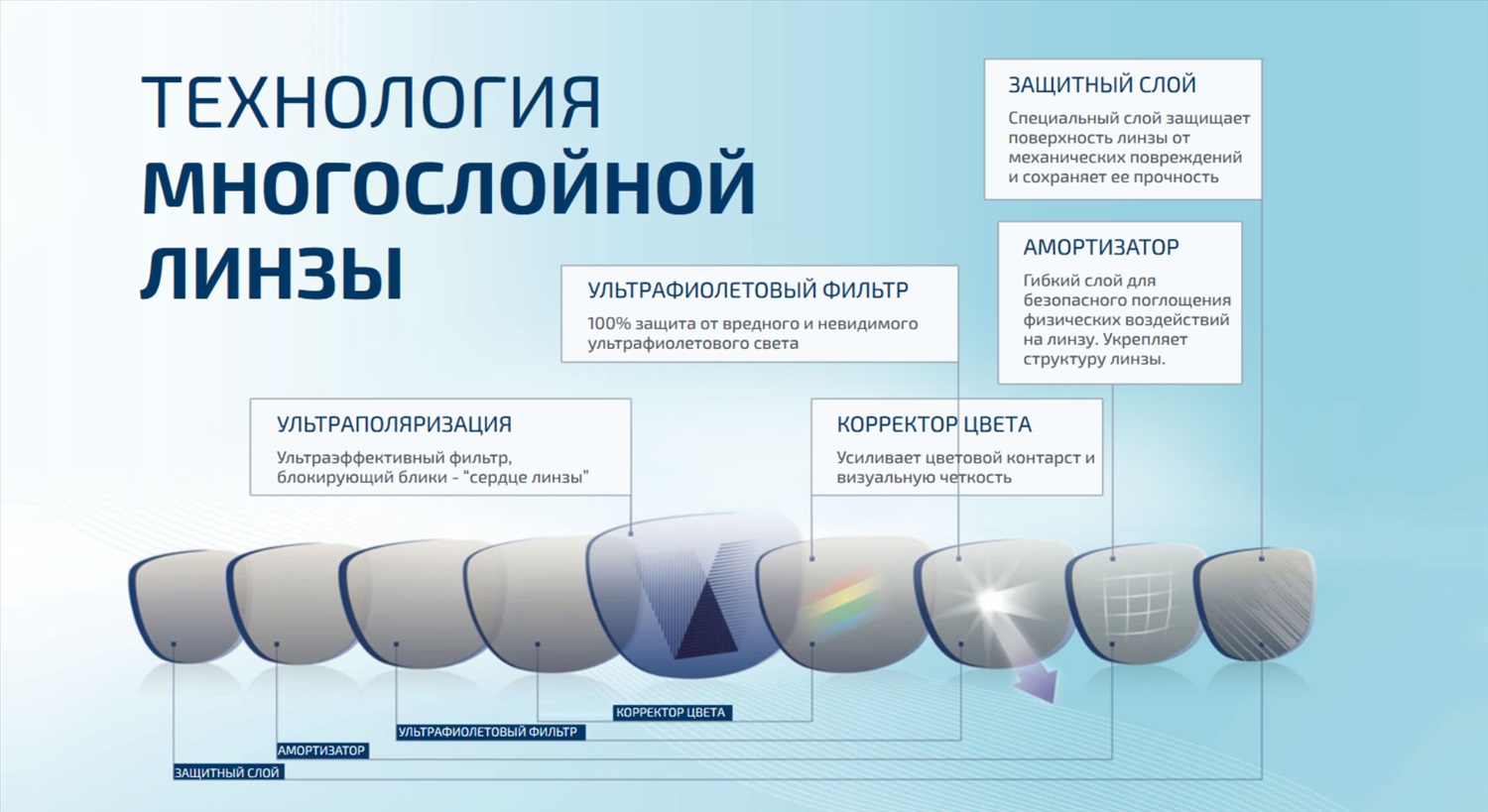 9 слойные поляризационные линзы, изготовленные по новой уникальной технологии, которая позволила значительно улучшить показатели блокировки бликов