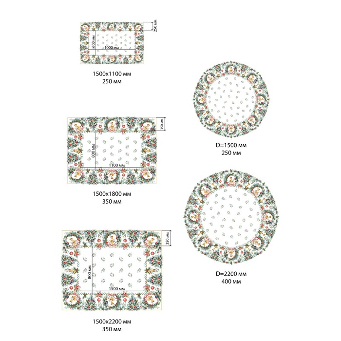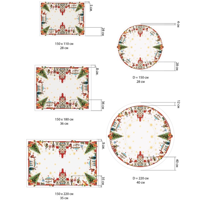 Размер: 110×150 см, 4 салфетки, 150×180 см, 220×150 см, 12 салфеток, d=150 см, d=220 см