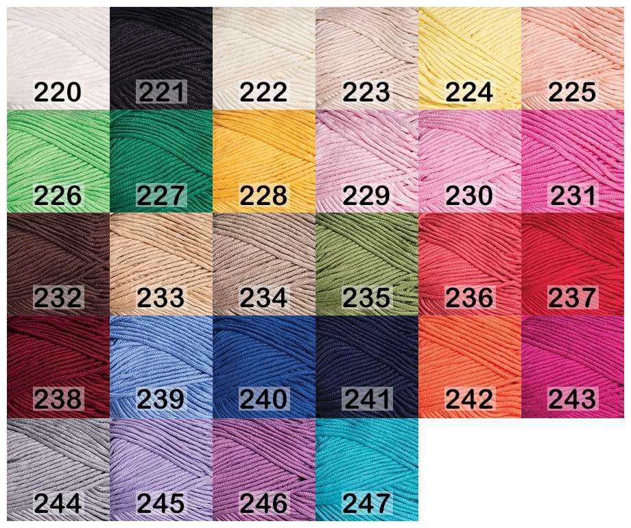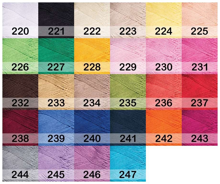 Цвет : 220 БЕЛЫЙ, 221 ЧЕРНЫЙ, 222 МОЛОКО, 223 ТОПЛЕНОЕ МОЛОКО, 224 СВ.ЖЕЛТЫЙ, 225 ПЕРСИК, 226 САЛАТОВЫЙ, 227 ИЗУМРУД, 228 ЖЕЛТЫЙ, 229 СВ.РОЗОВЫЙ, 230 РОЗОВЫЙ, 231 Т.РОЗОВЫЙ, 232 КОРИЧНЕВЫЙ, 233 СВ.БЕЖЕВЫЙ, 234 БЕЖЕВЫЙ, 235 ЗЕЛЕНЫЙ, 236 КОРАЛЛОВЫЙ, 237 КРАСНЫЙ, 238 БОРДОВЫЙ, 239 ГОЛУБОЙ, 240 ВАСИЛЕК, 241 Т.СИНИЙ, 242 ОРАНЖЕВЫЙ, 243 МАЛИНОВЫЙ, 244 СЕРЫЙ, 245 СВ.СИРЕНЕВЫЙ, 246 СИРЕНЬ, 247 БИРЮЗОВЫЙ