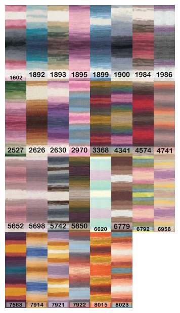 Цвет : 104 БИРЮЗОВО-ВИШНЕВЫЙ, 105 БЕЛО-ОРАНЖЕВЫЙ, 106 РОЗ-БЕЛЫЙ ГОЛУБ-СВ.ЖЕЛТ., 107 РОЗОВО-БЕЛЫЙ, 108 БЕЛО-МАЛИН.-ФИОЛ., 111 БЕЛО-ЖЕЛТЫЙ, 112 БЕЛ.-ГОЛУБ-СЕРЫЙ, 115 БЕЖ-ГОРЧ-ГОЛУБ-БЕЛЫЙ, 117 СВ.ЖЕЛТ-РОЗ ГОЛУБ-ЖЕЛТЫЙ