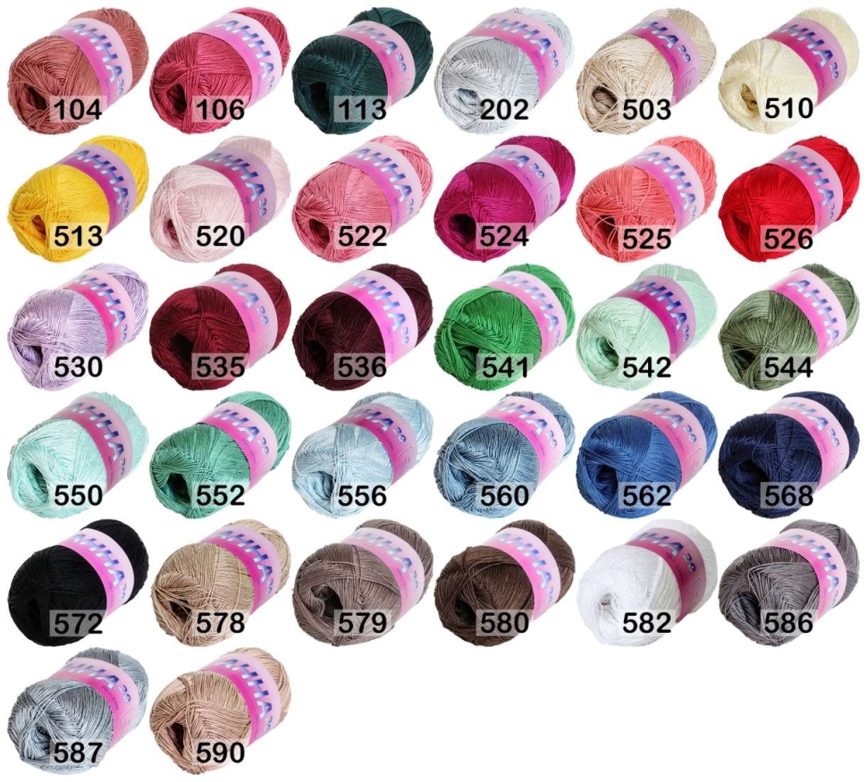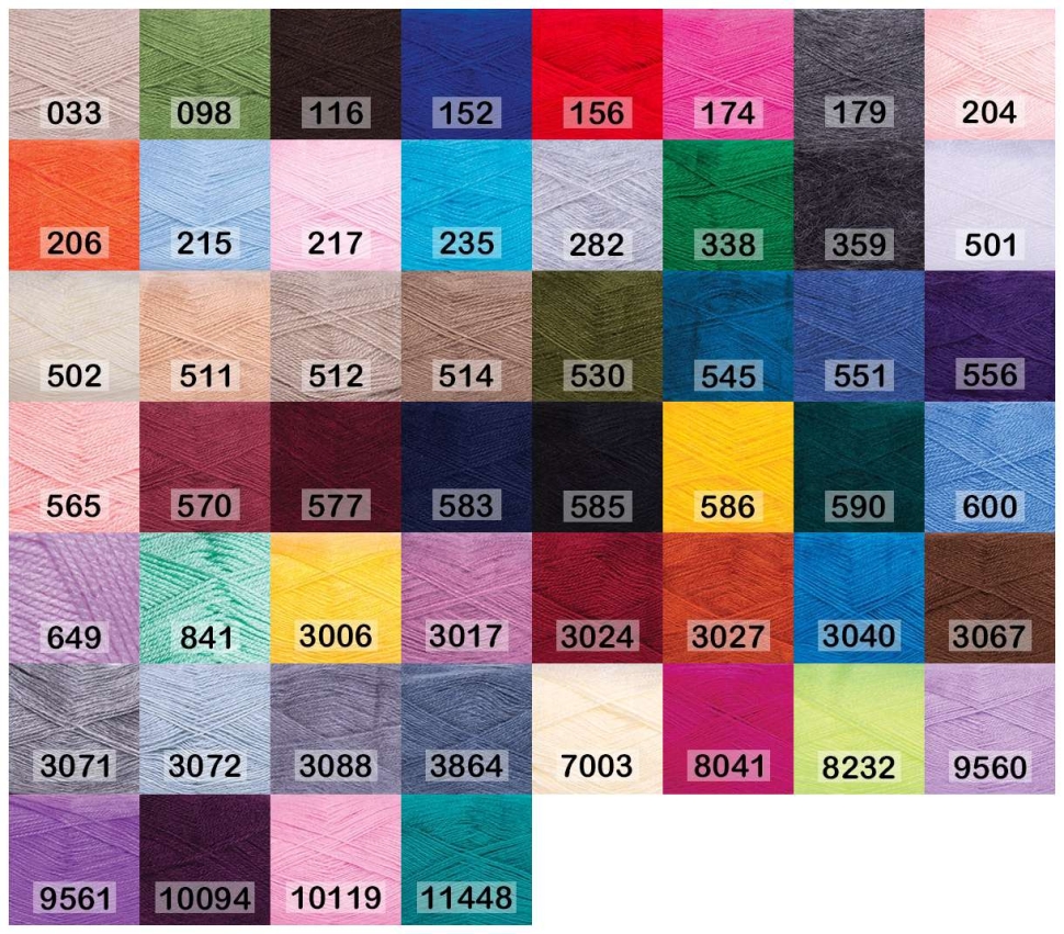 Цвет : 001 МОЛОЧНЫЙ, 002 КУКУРУЗНО-ЖЕЛТЫЙ, 011 ФИСТАШКОВО-ЗЕЛЁНЫЙ, 013 СВ.ЖЕЛТЫЙ, 016 БИРЮЗОВЫЙ, 019 НЕЖНО ЗЕЛЕНЫЙ, 027 СВ.СИРЕНЬ, 028 СУХАЯ РОЗА, 036 КРАСНЫЙ КИРПИЧ, 053 Т.СЕРЫЙ, 055 БЕЛЫЙ, 056 КРАСНЫЙ, 058 Т.СИНИЙ, 062 СВ.МОЛОЧНЫЙ, 072 БЕЖЕВЫЙ, 087 УГОЛЬНО СЕРЫЙ, 098 СУХАЯ РОЗА, 103 ЗЕЛЕНОЕ ЯБЛОКО, 107 ВИШНЯ, 111 СЛИВОВЫЙ, 141 ВАСИЛЕК, 149 ФУКСИЯ, 161 ПУДРА, 179 ВЕРБЛЮЖИЙ, 215 ФИОЛЕТОВО СИНИЙ, 234 ГЛИНА, 262 БЕЖЕВЫЙ, 280 СРЕДНЕ СИНИЙ, 287 ГОЛУБОЙ, 289 СИНИЙ, 294 ПЕТРОЛЬ, 302 СЕРЫЙ, 336 ОРАНЖЕВЫЙ, 340 ПУДРА, 377 ЯРКО РОЗОВЫЙ, 414 ЛАЗУРНЫЙ, 426 Т.ИЗУМРУД, 437 ЛАВАНДА, 509 ЖЕЛТЫЙ, 530 БЕЖЕВЫЙ, 534 БУРЫЙ, 619 КОРАЛЛ, 620 Т.ЗЕЛЕНАЯ ТРАВА, 637 ДЖИНС, 641 КРАСНО КОРИЧНЕВЫЙ, 646 ПЕТРОЛЬ, 742 СВ.ПЕРСИК, 767 ОРАНЖЕВО КРАСНЫЙ, 775 ЖЕЛТО ОРАНЖЕВЫЙ, 788 ЛАВАНДА, 847 ИЗУМРУД, 900 Т.СИНИЙ