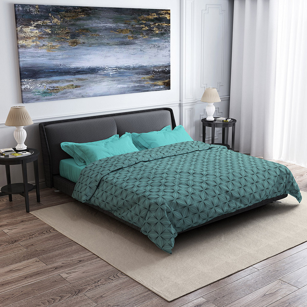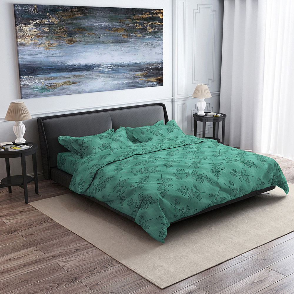 Постельное белье, комплект Евро Макси "Энигма, мятный"/"Мятный", 4 предмета: пододеяльник на кнопках 240х215см, простыня 220х240см, 2 наволочки 50х70см с клапаном-запахом, поплин "Комфорт" 115г/м2, хлопок 100%, упаковка "классическая" ПВХ 34,5х41см,