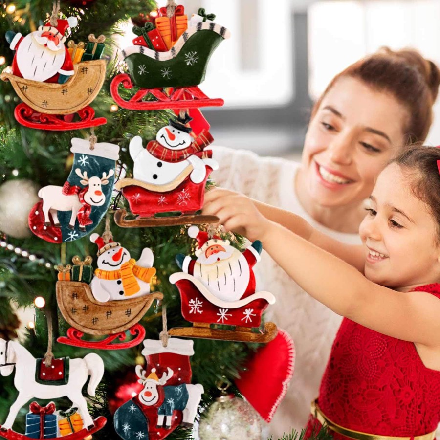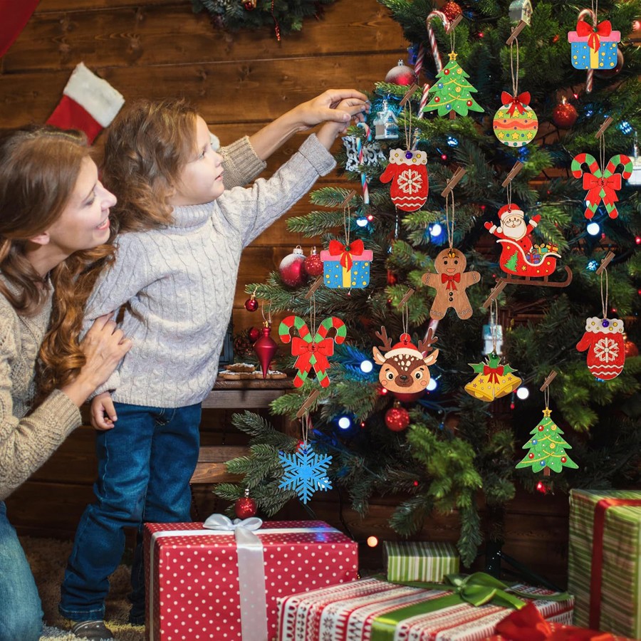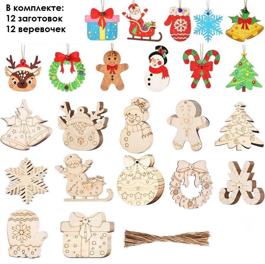 Новогодние елочные игрушки-заготовки из дерева для раскрашивания. Набор 12 штук с веревками