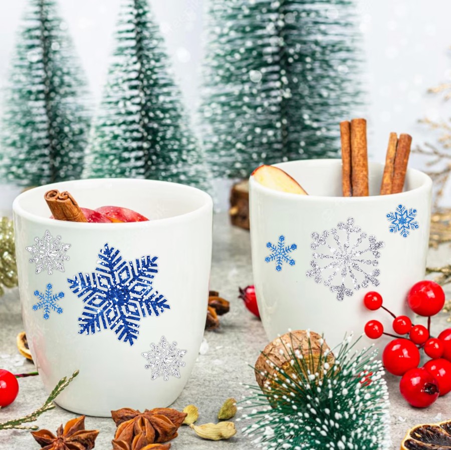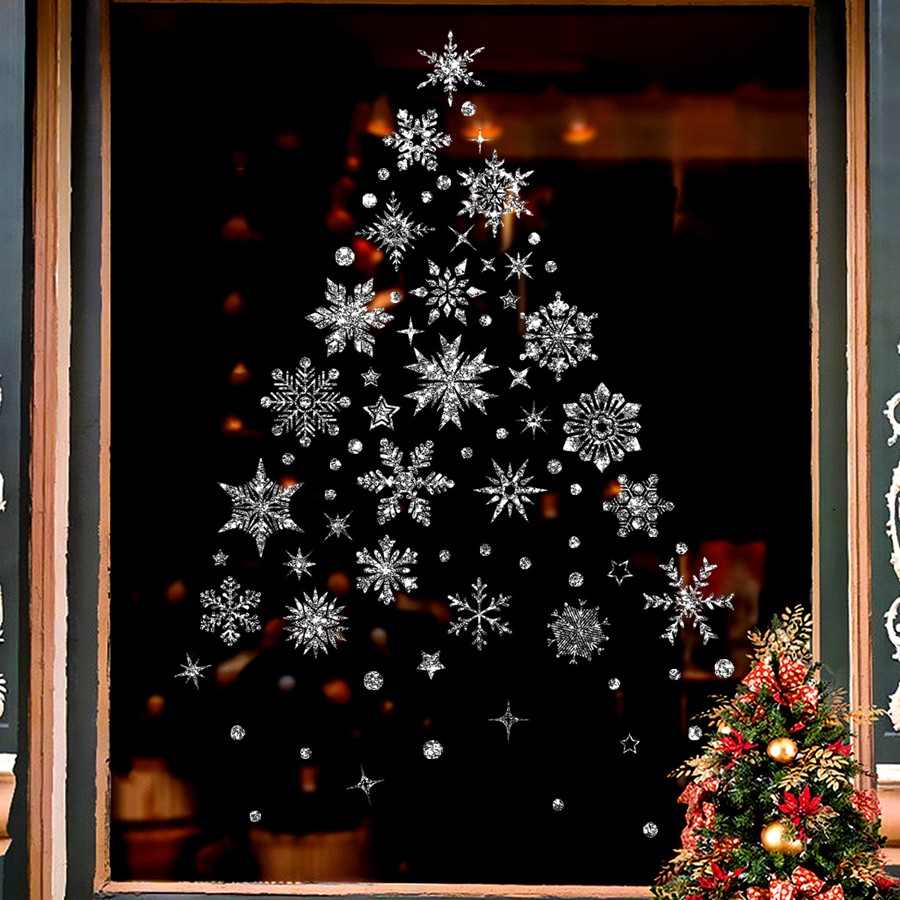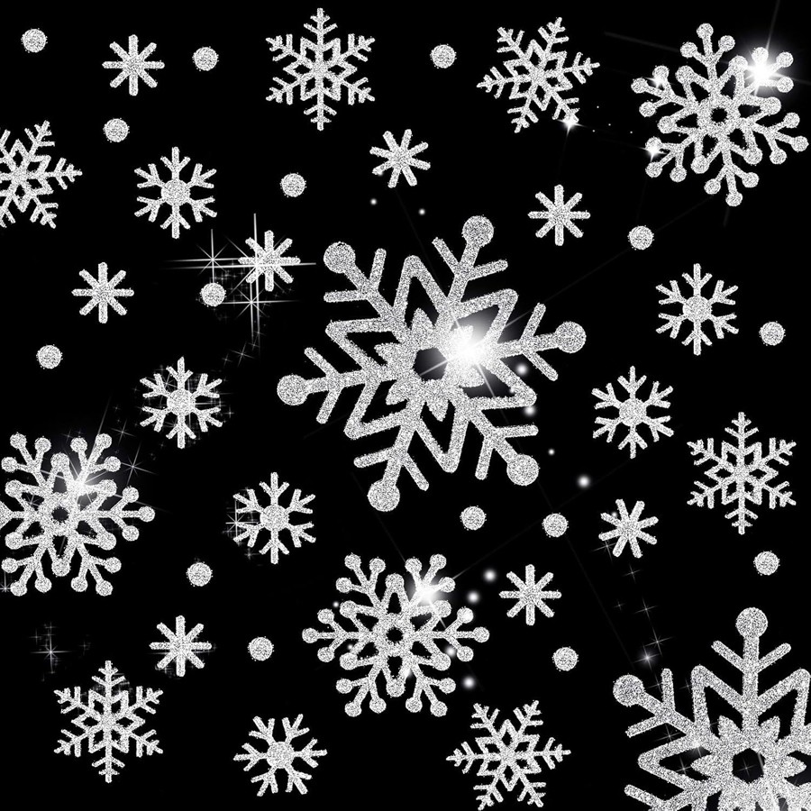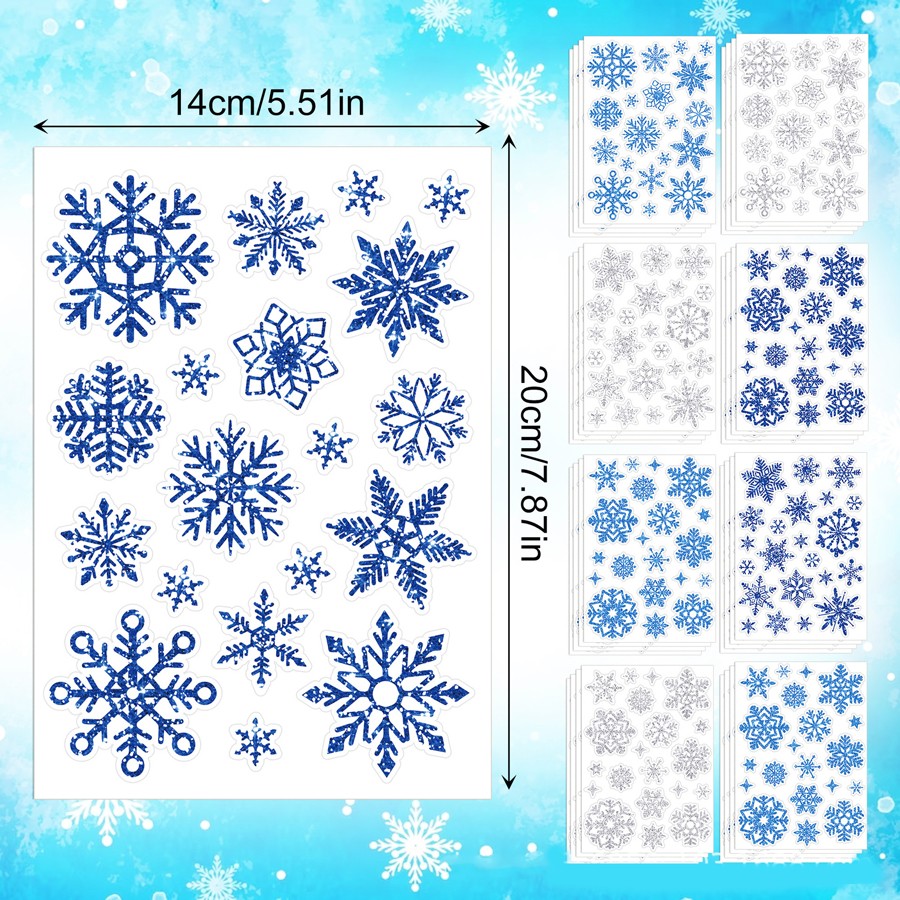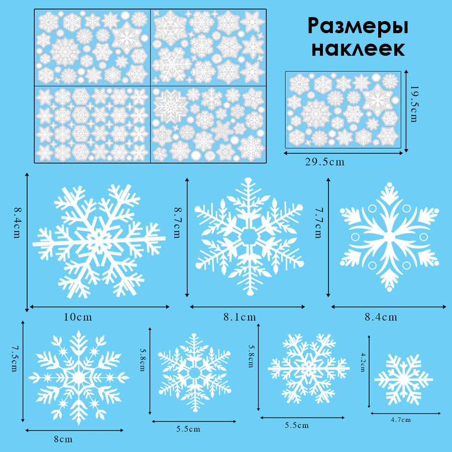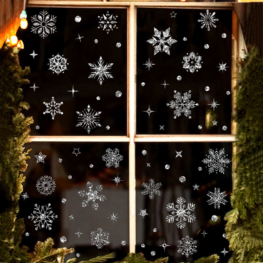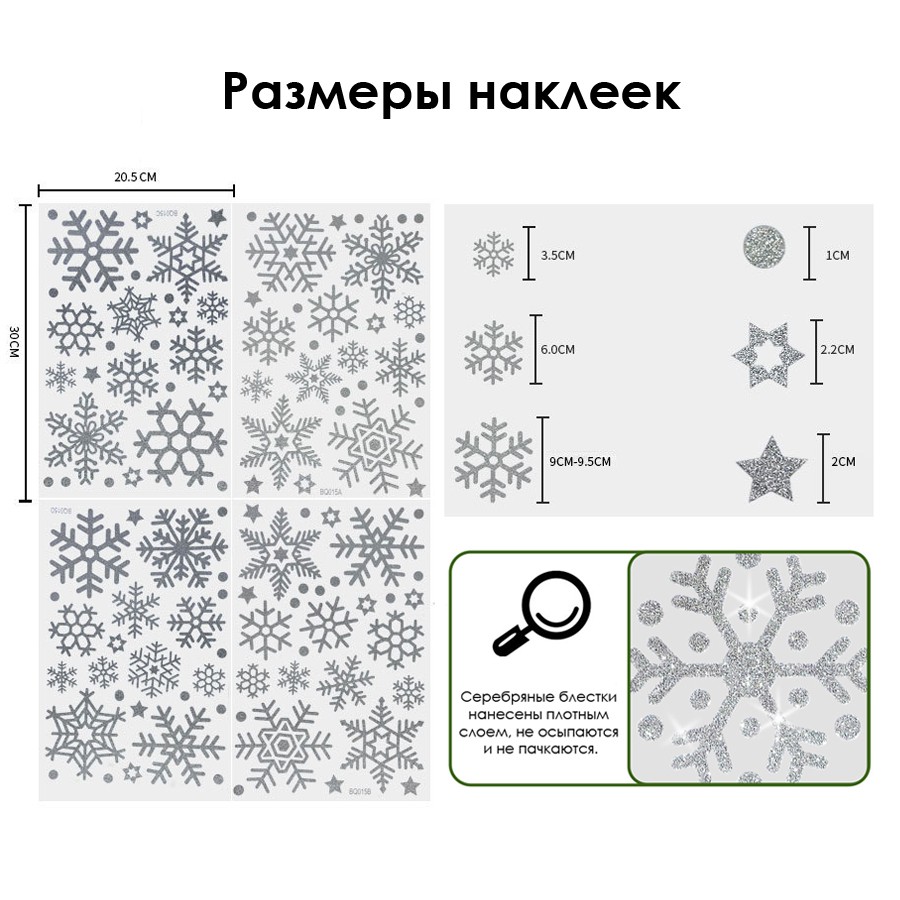 Наклейки на окна "Снежинки БЛЕСТЯЩИЕ" с серебряным глиттером 110 элементов 4 листа 20*30 см. Многоразовые, Без клея (Статические) BQ015