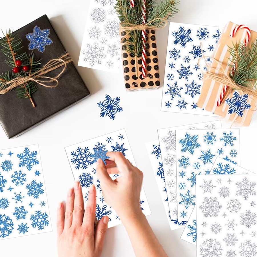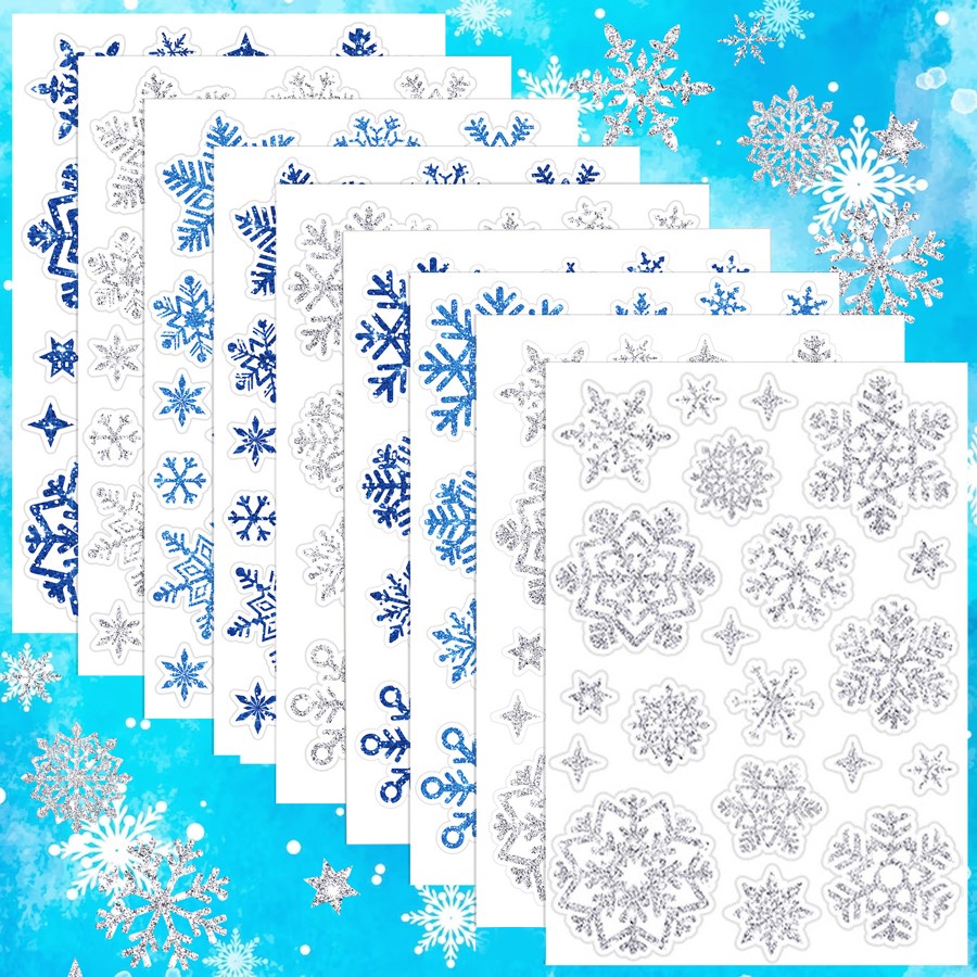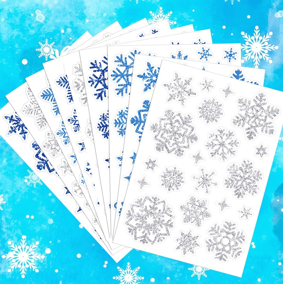 Наклейки СНЕЖИНКИ блестящие с глиттером Универсальные для творчества, Набор 9 листов 14*20 см. 3 цвета