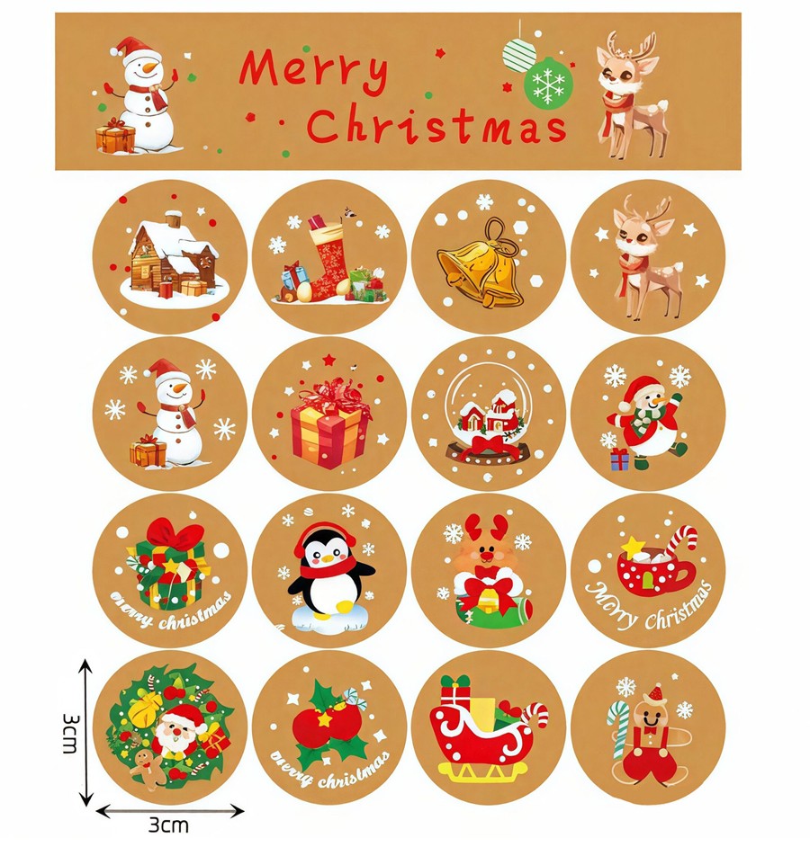 Наклейки новогодние круглые 1 лист 16 шт. Диаметр 3 см. СВЕТЛО-КОРИЧНЕВЫЕ