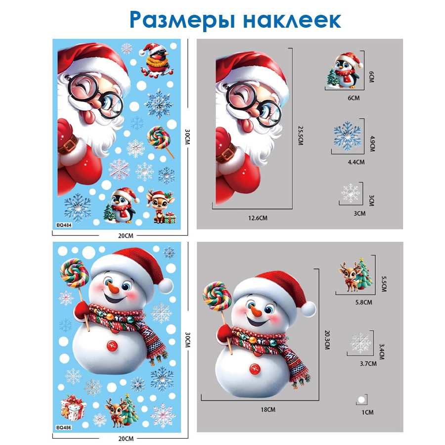 Наклейки на окна композиция "Деды Морозы и Снеговики" 119 элементов 4 листа 20*30 см. Многоразовые, Без клея (Статические) BQ482