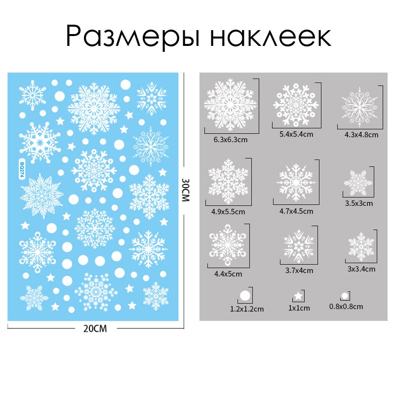 Наклейки на окна "Снежинки СВЕТЯЩИЕСЯ в темноте" 64 элемента 2 листа 20*30 см. Многоразовые, Без клея (Статические) BQ030