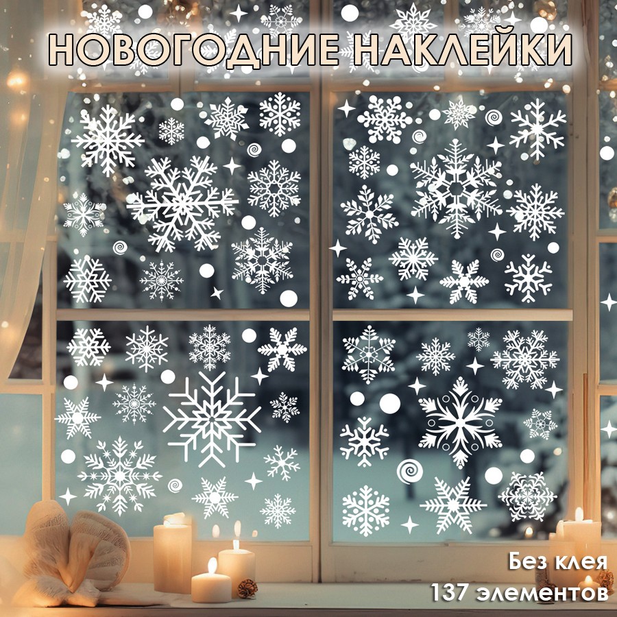 Наклейки на окна "Снежинки" 137 элементов 4 листа 20*30 см. Многоразовые, Без клея (Статические)
