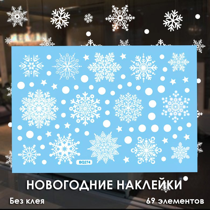 Наклейки на окна "Снежинки БЕЛЫЕ" 69 элементов 1 лист 20*30 см. Многоразовые, Без клея (Статические) BQ274